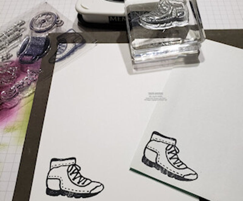 Masking an image is the same as we did for the sentiment. Stamp the image on the cardstock and on the masking paper. Fussy cut the image out and place it directly over the stamped image on the cardstock. (Tip: Place the masking sheet image so that just a smidge of the image on the cardstock shows so you won't have any gap in the images.) Stamp your image on the cardstock. The second image below show the mask in place and the second boot stamped over the mask. After removing the mask, the end result is the last image. Don't you just love it?