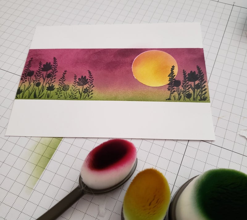 Using your Blending Brushes ink your cardstock. I used a heavy hand on this piece, but you do you and make it yours. Just be careful inking around the circle so it doesn't lift up on you. If it lifts, just press it down again and carry on. These masks are reusable if you plan to mass produce this project. Once you are happy with the ink blending remove the circle mask and proceed to Step 3.