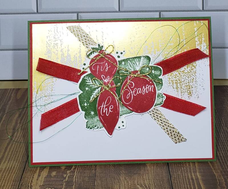 We also used the gorgeous Brushed Gold Cards and Envelopes pack in the Holiday Mini Catalog too. Various ribbon/threads to make this card pop!