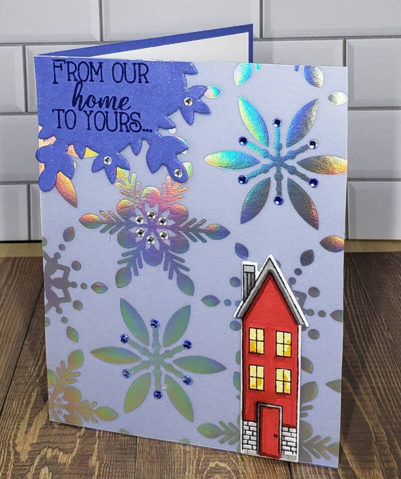 I used my Stampin' Blends to do a quick color of the house, cut a snowflake from the Festive Flurry dies and stamped both the snowflake and the inside of the card. Used my blends to color the gems to match and added them to the Specialty DSP.