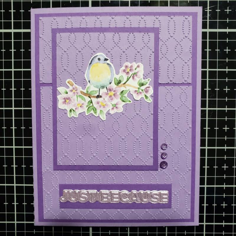 This card is using more Sale-A-Bration items. Sale-A-Bration items are free items earned with the purchase of $50.00 or $100.00. The Flight and Airy DSP (162977) is a $50.00 item and the Softly Sophisticated Bundle (162947) is a $100.00 item. (I used the embossing folder on today's project.) From the mini catalog I used the Thoughtful Moments Hybrid Embossing Folder ( 162927) for my sentiment.