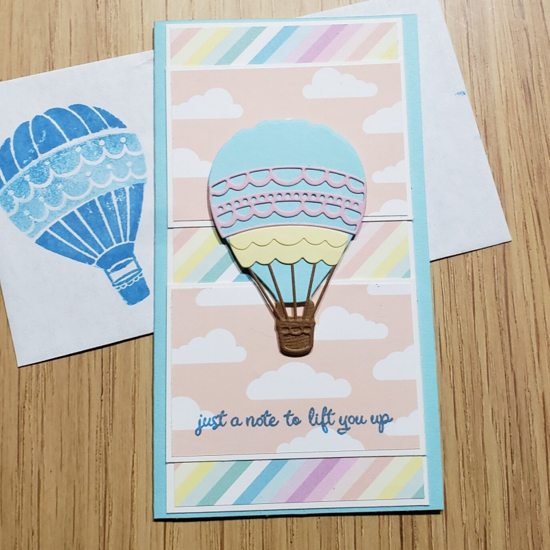 The second part of this post is a Mini Slimline Card layout using the Hot Air Balloon Stamp Set and Dies. It is currently available in a Bundle and as a Suite of Products. The Lighter than Air 6 x 6 DSP is amazing in beautifully combined pastel colors to the intricate dies that make up several different balloon designs.
