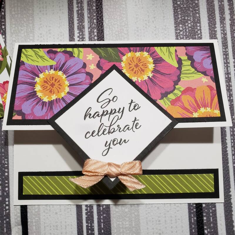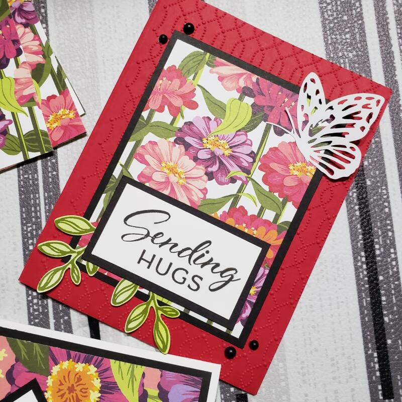 Today I am sharing cards made with the Online Exclusive Designer Series Paper Flowering Zinnias. Last I checked it IS available for purchase. I used the stamp set Layering Leaves and the Bough Punch. I used Black dots (I guess they aren't available any longer) and the Paper Butterfly Accents for embelishments. I used the softly sophisticated embossing folder on the card base (also no longer available).